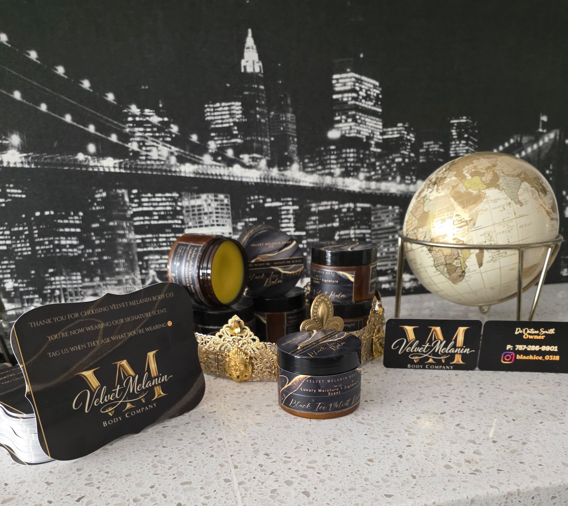 Velvet Melanin Body Co. was created from a simple realization: skincare should do more than moisturize — it should leave a lasting impression. Built around signature scent formulations and luxury hydration, the brand specializes in handcrafted body care designed for melanin-rich skin. What started as personal fragrance blending evolved into a premium skincare experience known for one thing above all — unforgettable scent. Today, Velvet Melanin Body Co. is redefining body care by merging skincare, fragrance, and identity into one luxury ritual.